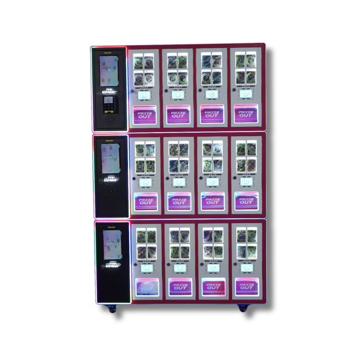 A brand new vending machine from UNIS Technology - a wall of vending units which dispenses trading card booster packs.